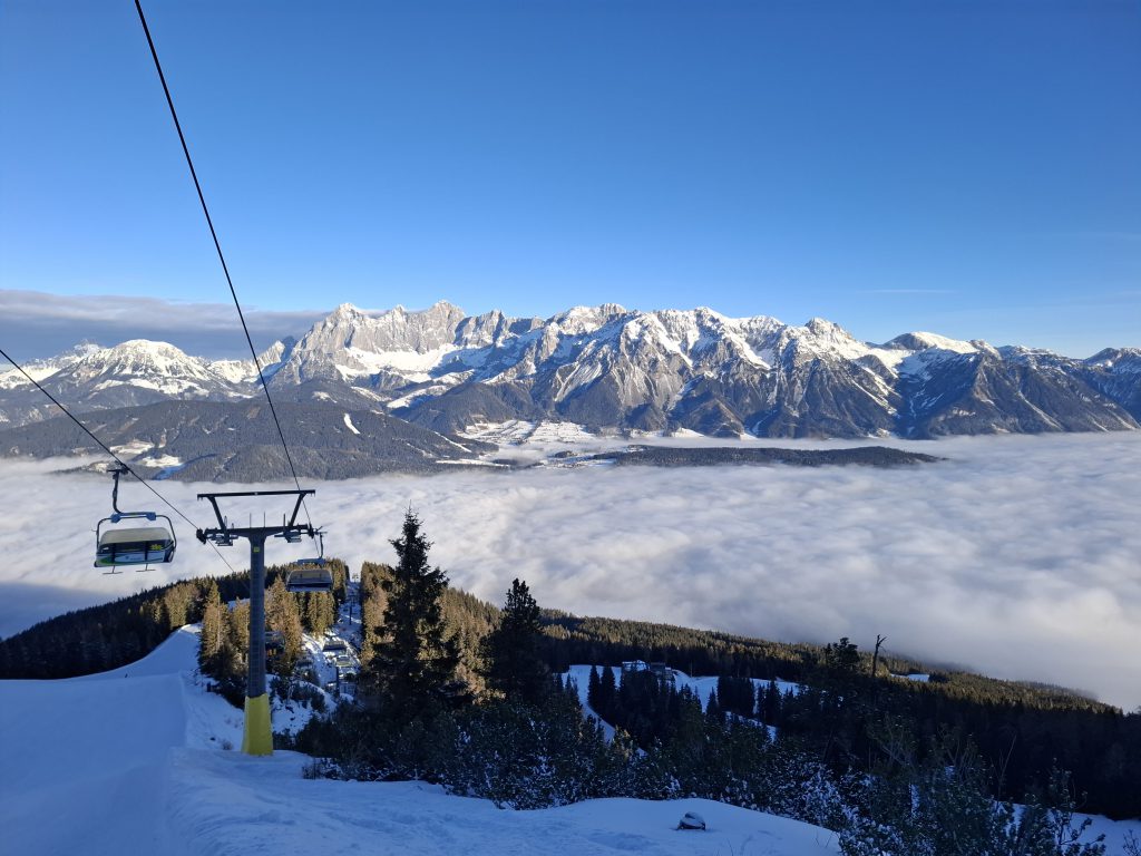 Nachdem am ersten Abend auch die letzten Mitglieder der Gruppe das Hotel in Rohrmoos oberhalb von Schladming erreicht hatten, folgten für die ganze Gruppe drei Tage bei bestem Skiwetter und hervorragenden Pistenverhältnissen auf den vier miteinander verbundenen Skibergen der Region „Dachstein“: Hauser Kaibling, Planai, Hochwurzen und Reiteralm.
